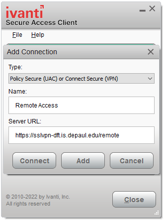 Connecting to DePaul's Virtual Private Network (VPN) through the Ivanti client requires the use of the Microsoft Authenticator app and BlueKey multi-factor authentication (MFA). You will need to download the Microsoft Authenticator app and setup BlueKey MFA at bluekey.depaul.edu/multifactorsetup (if you haven't already done so) prior to accessing the VPN. Learn more about registering for BlueKey MFA.