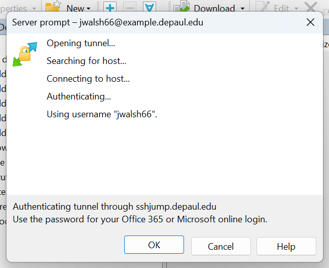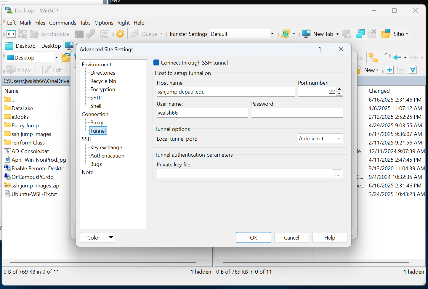 Click on Advanced, then click on Tunnel. You will need to check “Connect through SSH tunnel” and then enter the “Host name” for the proxy server. You should enter “sshjump.depaul.edu”. Then enter in your BlueKey username and click ok to save your entry.