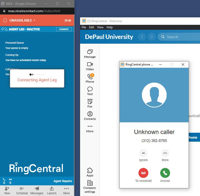 - RingCentral Call Center Agent (MAX) - This is where most interactions occur. Here is where you accept calls, see information about the calls, and do things like transfers. Link: https://ccagent.is.depaul.edu/